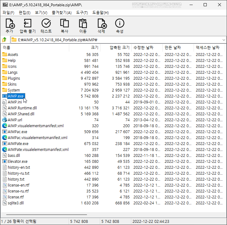 MP3 재생 프로그램 AIMP 5.10 Build 2418 포터블 버전은 32-bit 윈도우 시스템에서는 파일 크기 약 15.22MB인 'AIMP v5.10.2418 X32 Portable.zip' 파일, 64-bit 윈도우 시스템에서는 파일 크기 약 17.17MB인 AIMP v5.10.2418 X64 Portable.zip' 파일을 다운로드 받아 압축을 풀고 폴더 내 'AIMP.exe' 파일을 실행하면 설치 과정 없이 바로 사용할 수 있습니다.