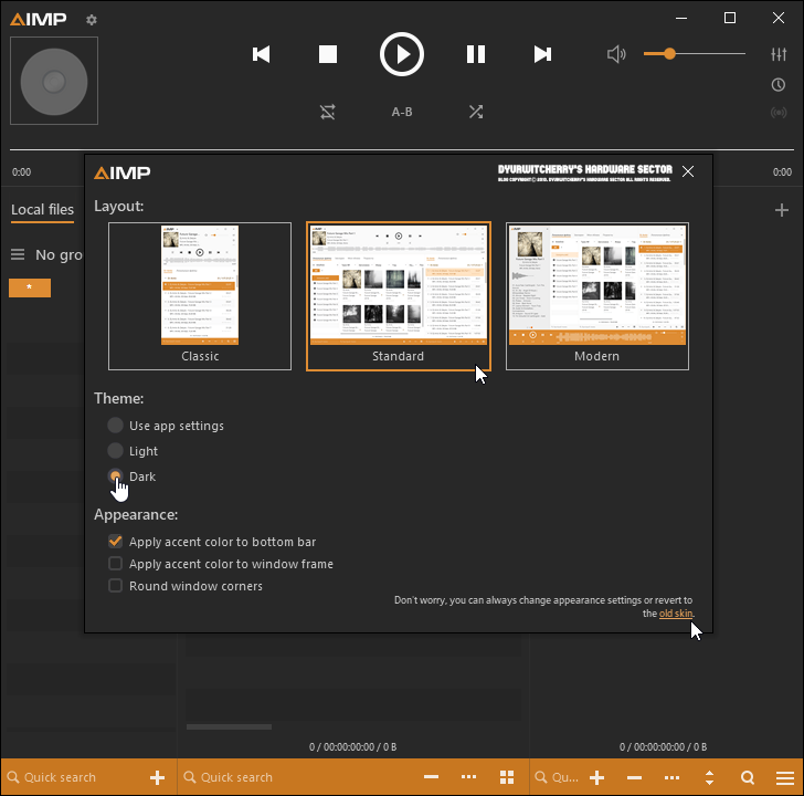 MP3 플레이어 AIMP 5.10 Build 2418 포터블 버전을 실행하면 '☼' 설정 창이 함께 활성화 되어 Layout:의 Classic과 Standard, Modern 중에서 인터페이스를 선택하고, Theme: 항목에서 기본 값인 '◉ Use app settings'에서 'Light'와 'Dark' 테마 중에서 라디오 버튼을 체크하면 됩니다.