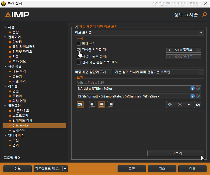 *AIMP 플레이어 정보 표시줄 설정하는 방법
