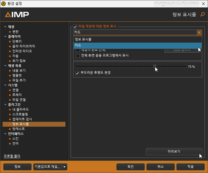 AIMP 플레이어 파일 재생에 대한 정보를 카드로 표시 설정하는 방법은 '☑ 파일 재생에 대한 정보 표시' 바로 아래의 '정보 표시줄 ▽'의 하단 콤보 버튼을 눌러 '카드'로 선택하면, 세부 메뉴가 '☑ 부드러운 투명도 변경'의 막대바 이동 버튼 기본값 75%'로 변경되어 적용 됩니다.