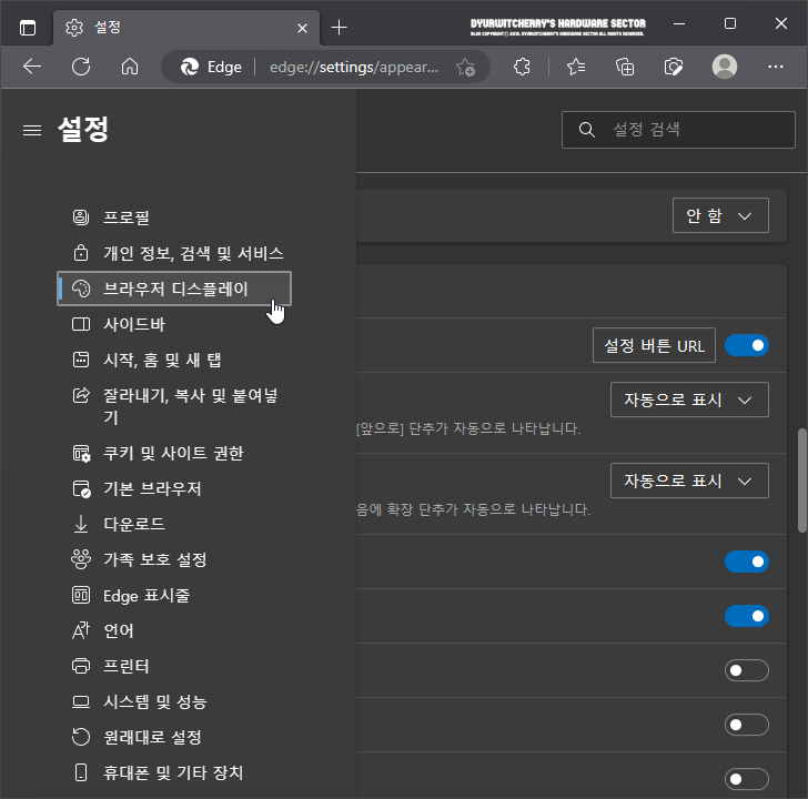 엣지 '☰ 설정(edge://settings)' 창이 브라우저 설정에 따라 현재 탭 또는 새 탭, 새 창으로 활성화 되면, 좌측의 설정 메뉴 중 '브라우저 디스플레이' 항목을 선택합니다. 참고로, 마이크로소프트 엣지 브라우저 사이드바가 표시가 활성화 되어 있는 경우에는 Microsoft Edge Browser 우측 사이드바 하단의 엣지 사이드바 숨기기 '⍈' 버튼 아래 '☼' 설정 버튼을 클릭한 후 '브라우저 디스플레이 항목을 선택하여도 동일하게 설정 할 수 있습니다.
