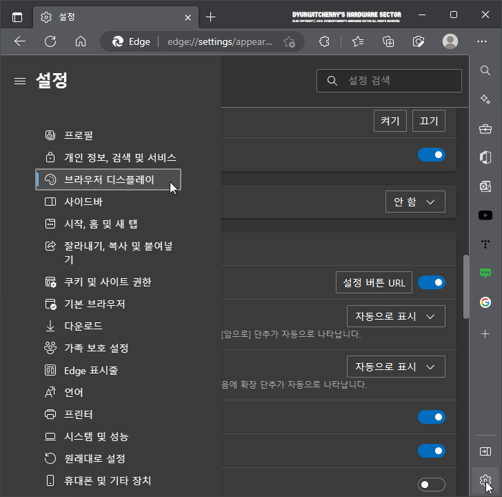 마이크로소프트 엣지 '☰ 설정(edge://settings)' 창이 브라우저 설정에 따라 현재 탭 또는 새 탭, 새 창으로 활성화 되면, 좌측의 설정 메뉴 중 '브라우저 디스플레이' 항목을 선택합니다. 참고로, 마이크로소프트 엣지 브라우저 사이드바가 표시가 활성화 되어 있는 경우에는 Microsoft Edge Browser 우측 사이드바 하단의 엣지 사이드바 숨기기 '⍈' 단추 아래 '☼' 설정 버튼을 클릭한 후 '브라우저 디스플레이 항목을 선택하여도 동일하게 설정 할 수 있습니다.