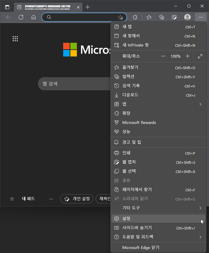 마이크로소프트 엣지 브라우저 '뒤로 이동: 🡰'과 '앞으로 이동: 🡲' 화살표 표시 설정하는 방법은 먼저, Microsoft Edge Browser 상단 URL 주소 표시줄 우측의 '…' 메뉴 버튼을 선택하여 아래로 활성화 되는 세부 항목 중 '☼ 설정' 항목을 클릭하면, 브라우저 설정에 따라 현재 탭 또는 새 탭, 새 창으로 '☰ 설정(edge://settings)' 창이 활성화 됩니다.