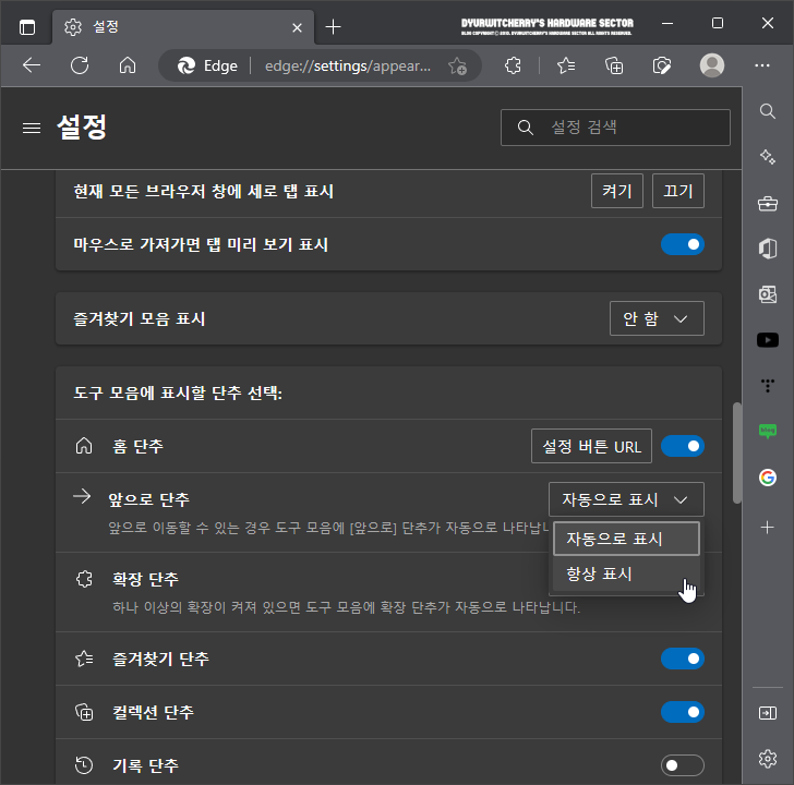 *마이크로소프트 엣지 앞으로 이동 ➜ 화살표 항상 표시 설정하는 방법