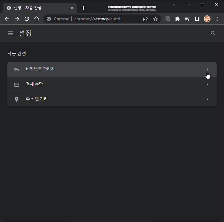 구글 크롬 브라우저에 저장되어 있는 비밀번호 수정 및 삭제하기 위해서는 Chrome 자동 완성 설정 페이지에서 '비밀번호 관리자 ▷'를 선택합니다. 참고로, 자동 완성 메뉴에서는 은행 계좌번호와 신용카드 등의 '결제 수단 ▷'과 함께 '주소 및 기타 ▷' 항목을 선택하여 인터넷 쇼핑몰에서 구매 시 배송지로 입력한 주소와 전화번호 등을 추가하거나 수정 및 삭제할 수 있습니다.