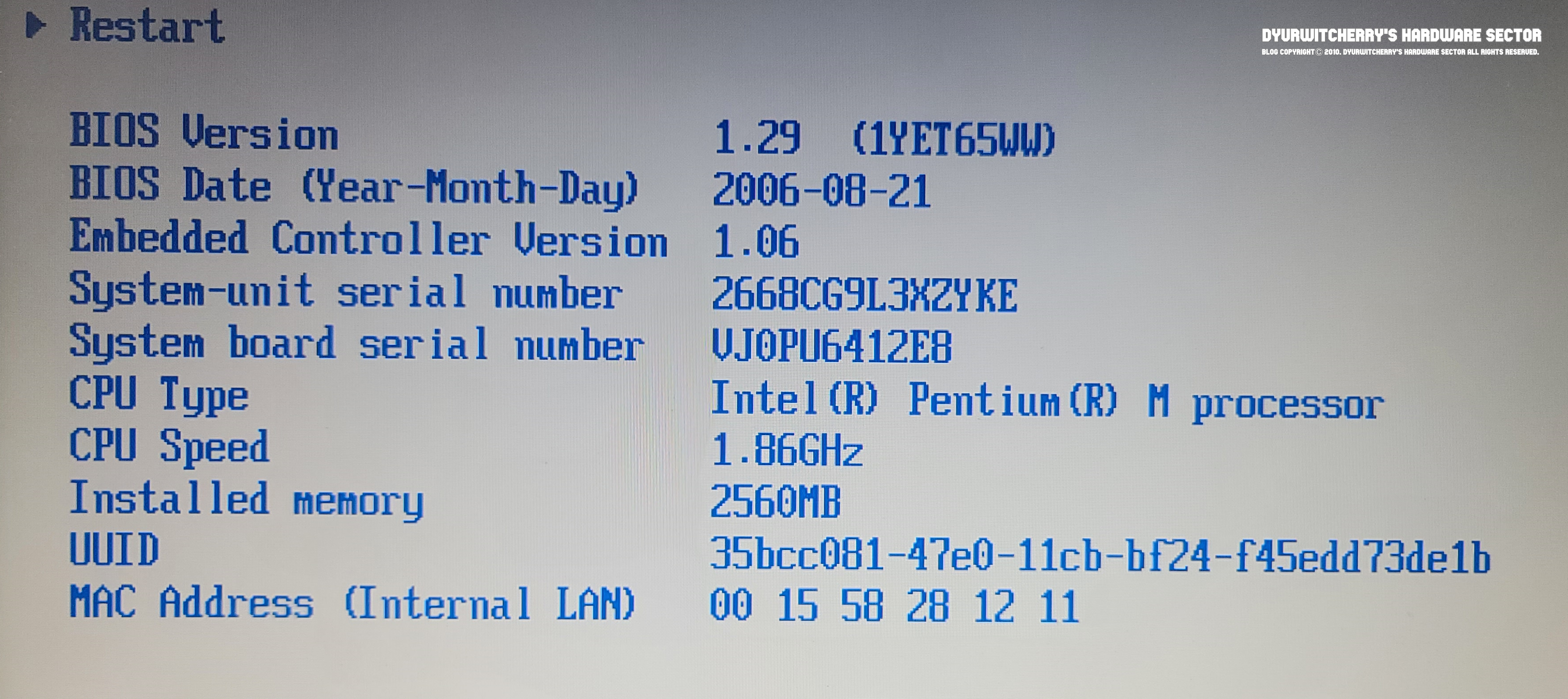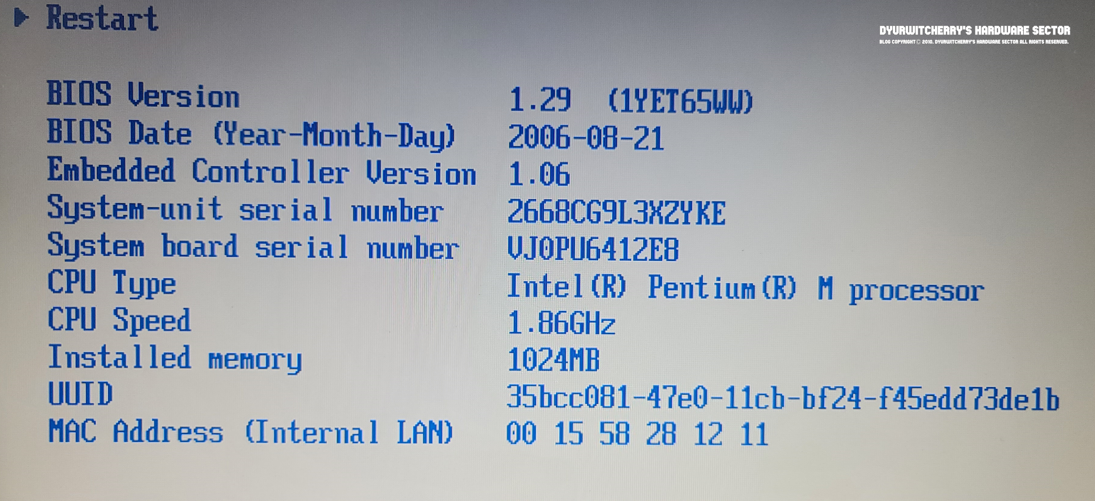 노트북은 PC와 마찬가지로 'Delete' 또는 'F2' 키를 눌러 바이오스에 진입할 수 있으며, IBM ThinkPad T43 노트북의 경우에는 전원을 켜고 바로 'F1'키를 누르면 BIOS 화면으로 진입 됩니다. 위의 이미지는 IBM 씽크패드 T43의 하드웨어를 확인 할 수 있는 CMOS 화면으로, Intel Mobile Pentium M 750 @ 1.86GHz 프로세서에 설치되어 있는 메모리는 1024MB(1GB)인 것을 확인 할 수 있습니다.