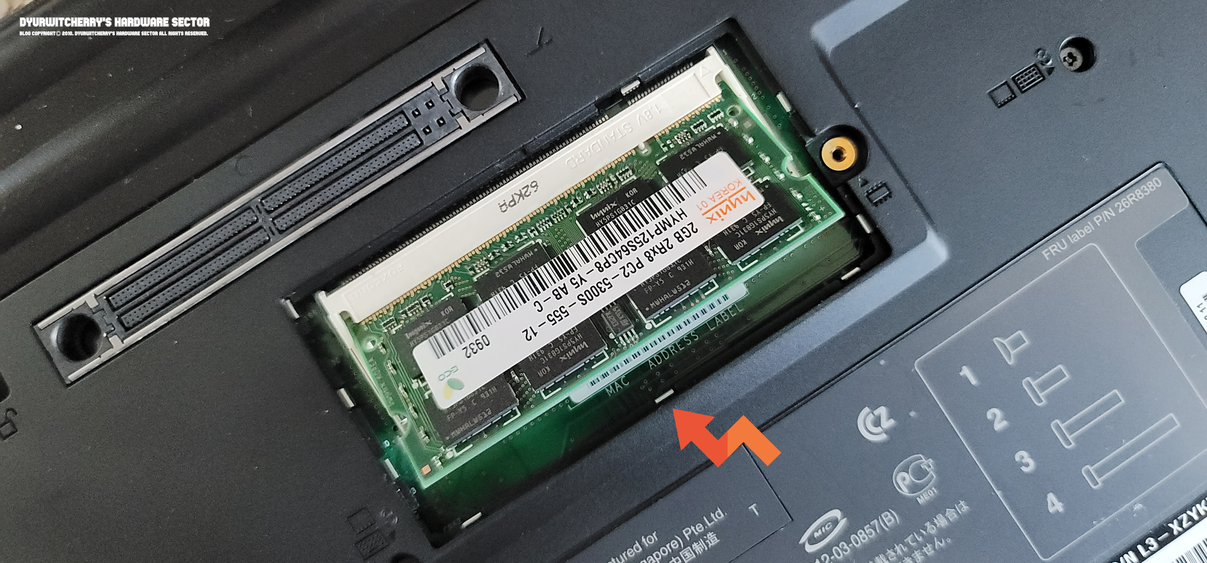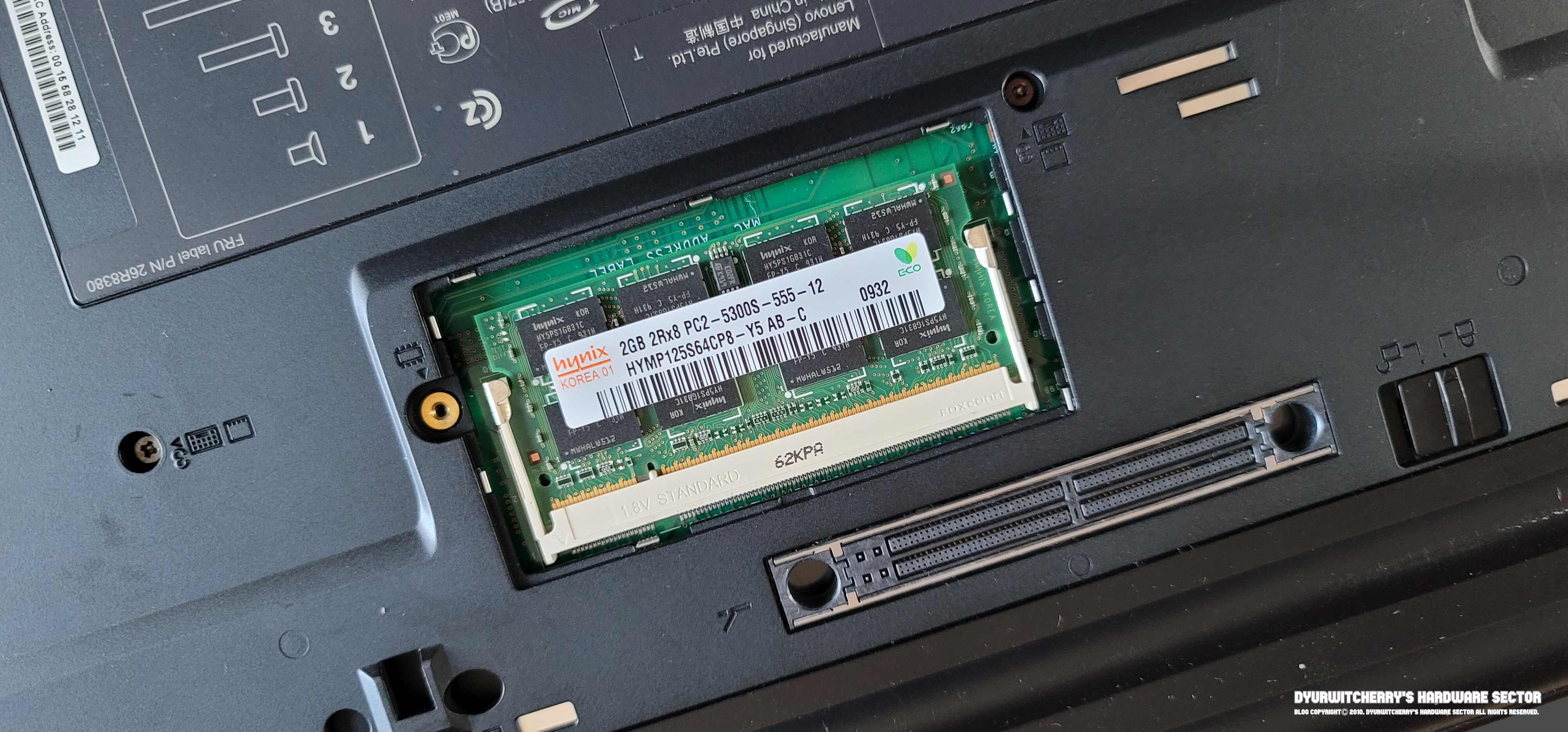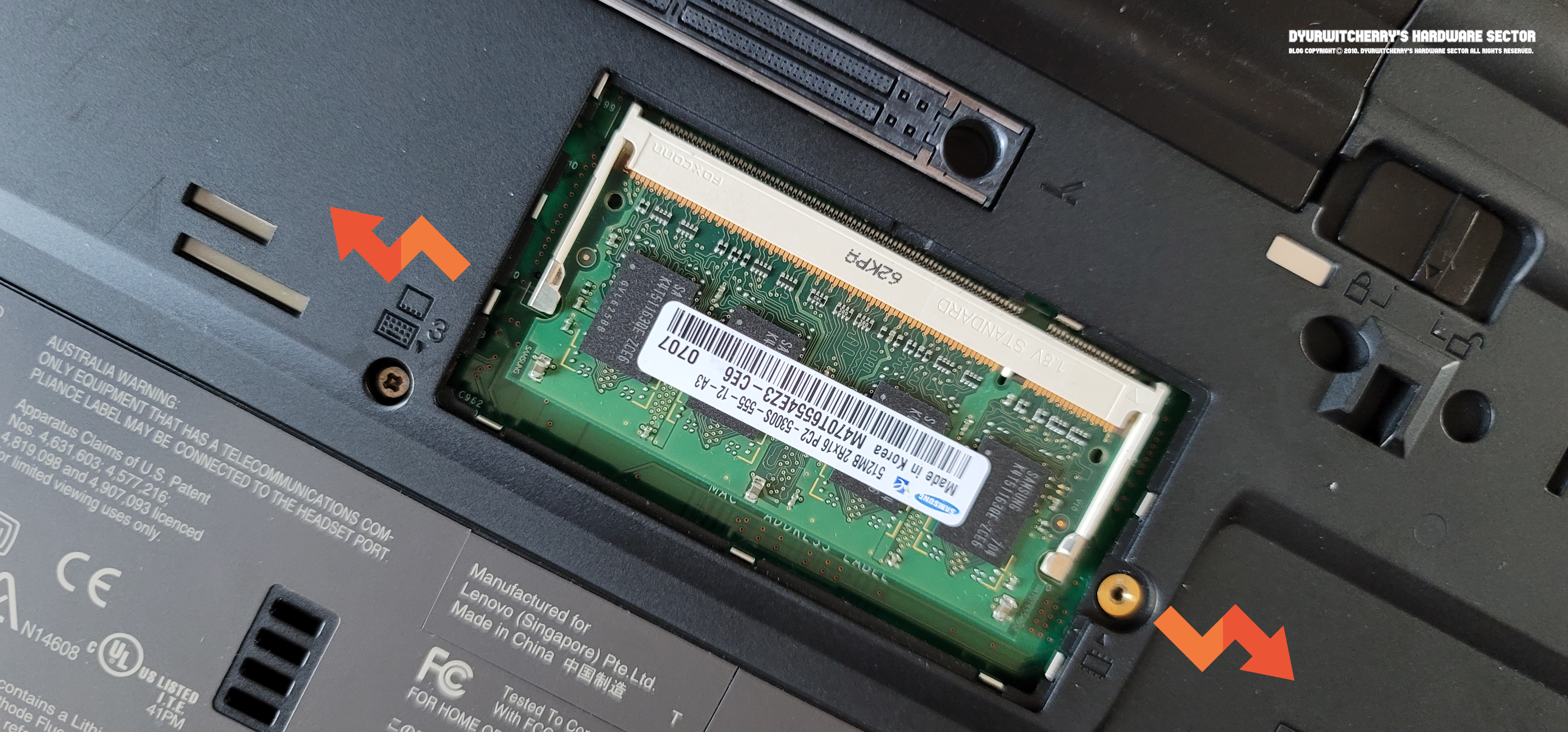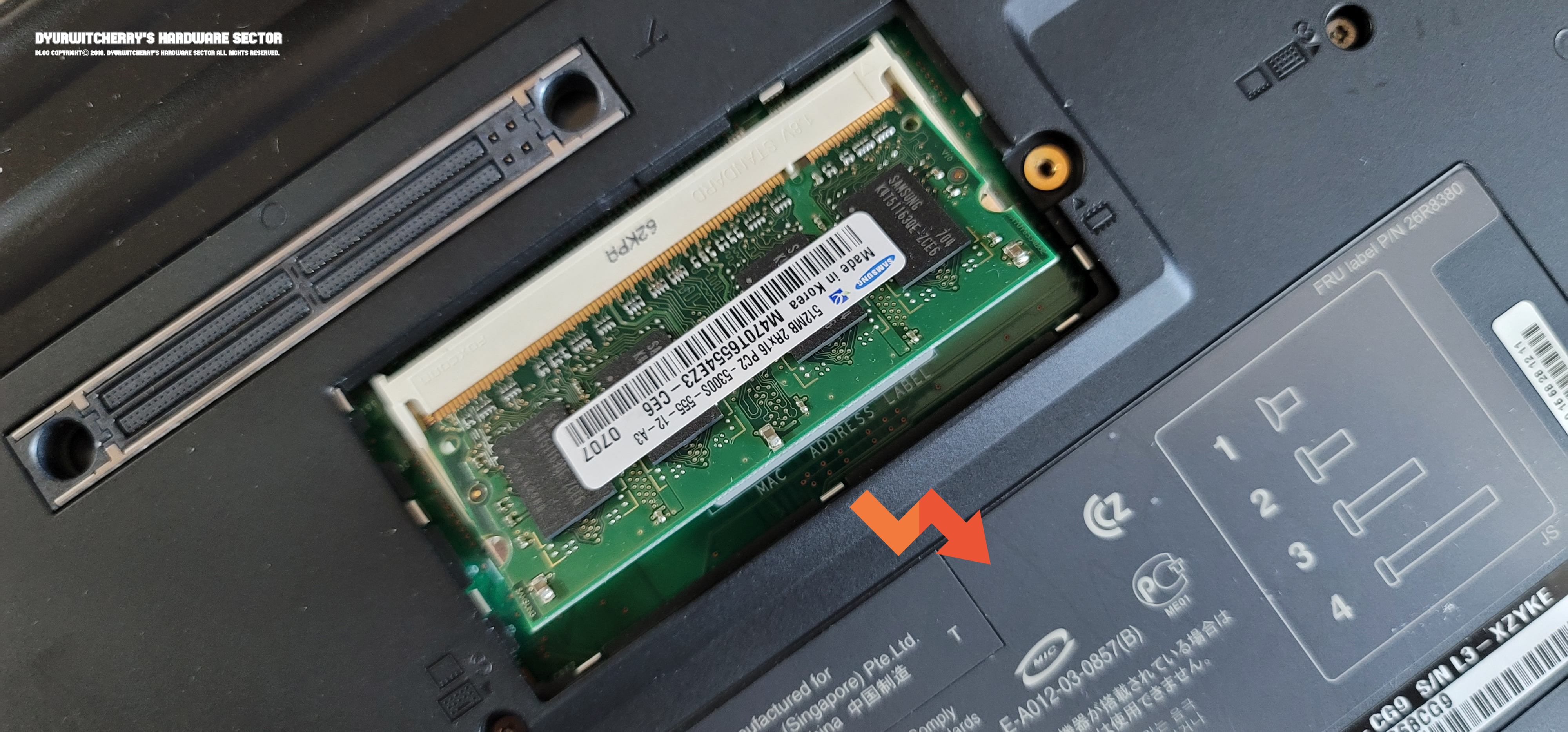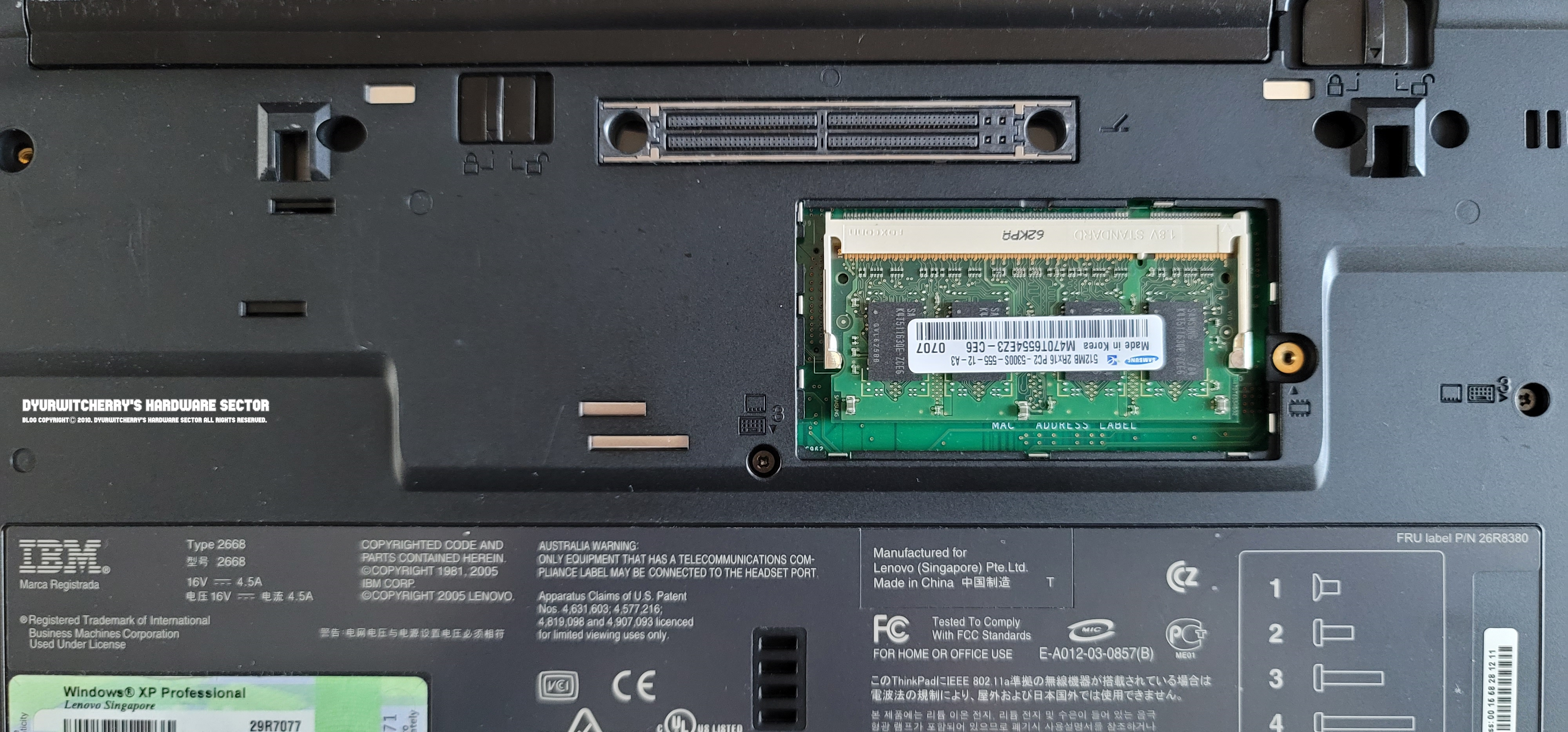 IBM 씽크패드 T43 노트북에 장착되어 있던 SAMSUNG PC2-5300S 512MB을 분리하여 빈 슬롯에 교체하고자 하는 메모리 'ex. Hynix PC2-5300S 2GB SO-DIMM 200-Pin RAM'을 약 20° 내외의 각도로 '금도금 된 리드(Gold-plated leads)'에 조심 스럽게 밀어 끼워 넣습니다.