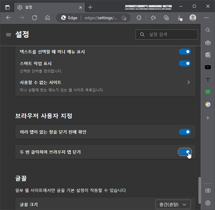 *마이크로소프트 엣지 두번 클릭하여 브라우저 탭 닫기 설정하는 방법