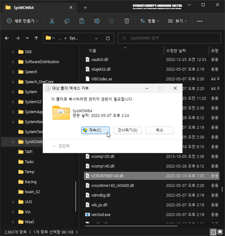 첨부 파일에서 'VCRUNTIME140.dll' 파일을 다운로드 받아 컴퓨터 드라이브에 저장한 후 파일 탐색기를 실행하여 32-bit 윈도우에서는 'C:\Windows\System32', 64-bit 윈도우에서는 'C:\Windows\SysWOW64' 경로에 복사 또는 이동을 하면 '대상 폴더 액세스 거부 : 이 폴더로 이동하려면 관리자 권한이 필요합니다.' 창이 활성화 되는데 '계속(C)' 버튼을 눌러 저장 할 수 있습니다.