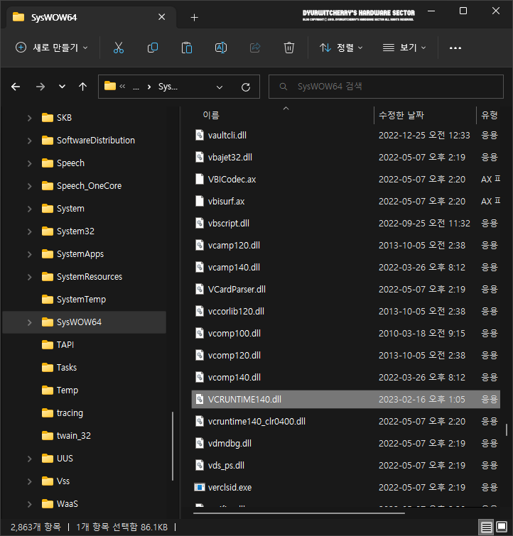파일 탐색기를 실행하여 64-bit 윈도우에서 'C:\Windows\SysWOW64' 경로에 'VCRUNTIME140.dll' 파일을 복사하여 저장된 것을 확인한 다음, 시스템 오류가 발생한 응용 프로그램을 다시 실행하여 정상적으로 작동하는 확인하면 됩니다. 참고로, 32-bit 윈도우에서는 'VCRUNTIME140.dll.x86' 파일을 다운로드 받아 '*.dll' 뒤에 파일 굽분을 위해 추가 한 확장명 '.x86'을 지우고 'VCRUNTIME140.dll'로 변경하여 'C:\Windows\System32' 경로에 관리자 권한으로 저장하면 됩니다.