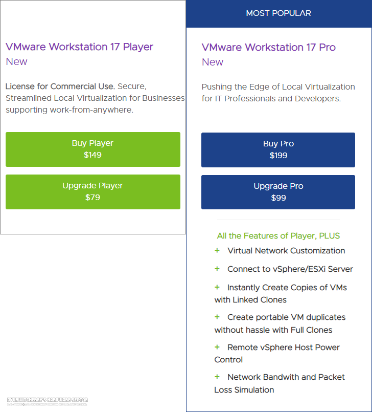 컴퓨터 가상화 소프트웨어 중 대표적인 프로그램인 VMware는 데스크탑 제품과 서버 소프트웨어, 클라우드 관리 소프트웨어와 애플리케이션 관리, 스토리지와 네트워킹 및 보안 계열 제품군으로 구분되고, 1999년 05월 15일에 Windows와 Linux용 VMware Workstation이 출시 되었습니다. 데스크탑 PC 버전 기준으로 현재 VMware Workstation 17 Pro 버전과 개인 사용자가 비상업적인 용도로 무료 사용할 수 있는 VMware Workstation Player 버전으로 구분 되며, 기본 적인 기능은 동일하지만 네트워킹 및 보안 기능 등 세부 기능에는 차이가 있습니다.