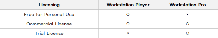 VMware Workstation Player 버전은 개인 사용자에 한하여 무료로 사용 할 수 있고 그외의 경우 상업용 라이선스를 구매해야 하며, VMware Workstation Pro 버전은 평가판으로 30일간 무료로 사용할 수 있는 트라이얼 버전으로도 배포 되지만, 기본적으로 개인 사용자도 라이선스를 구매하여 사용해야 합니다.