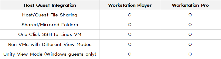 VM웨어 프로 버전과 플레이어 버전 모두 호스트와 게스트 간 파일 공유와 공유 및 이러링 된 폴더, 리눅스 가상 머신에 대한 원클릭 SSH 및 여러 뷰 모드로 가상 머신을 실행하고, 윈도우 게스트에서는 Unity 뷰 모드를 지원합니다.