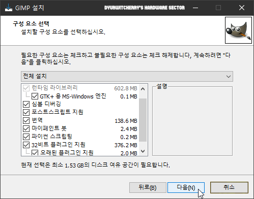김프 설치 구성요소 선택에서 GTK+용 MS-Windows 엔진과 심볼 디버깅, 포스트 스크립트 지원과 번역, 마이페인트 붓과 파이썬 스크립팅, 32비트 플러그인과 오래된 플러그인 지원 등 전체 또는 필요한 항목을 '☑' 체크하고 '다음(N) 버튼을 클릭합니다.