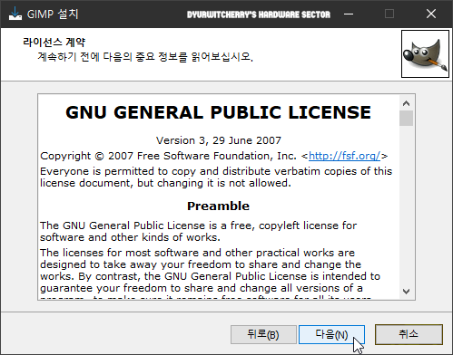 설치 방법을 선택하고 라이선스 계약 단계에서 영문으로 소개되어 있는 'GNU GENERAL PUBLIC LICENSE' 관련 내용을 확인하고 하단의 '다음(N)' 버튼을 클릭합니다.