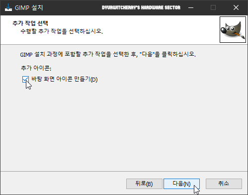 구성요소 선택 후 추가 작업 선택의 '추가 아이콘:' 항목에서 기본 값에서는 체크 해제되어 있는 '☑ 바탕 화면 아이콘 만들기(D)'를 사용 환경에 따라 '☑' 체크하고 '다음(N)' 버튼을 선택 합니다.