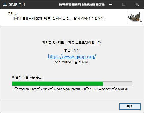 김프 설치는 플러그인과 브러쉬 등의 전체 설치 또는 사용자 정의 설치에 따라 설치 시간에는 다소 차이가 있고 설치 중에 '취소' 버튼을 눌러 설치를 취소 할 수도 있습니다.