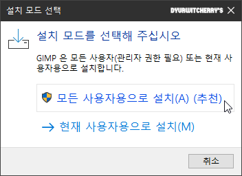 GIMP 2.10.34 버전 설치 파일을 실행하면 '설치 모드 선택' 창이 활성화 되어 '설치 모드를 선택해 주십시오' 하단의 관리자 권한이 필요한 모든 사용자용으로 설치(A) (추천)'와 '→ 현재 사용자용으로 설치(M)' 중에서 선택 합니다.