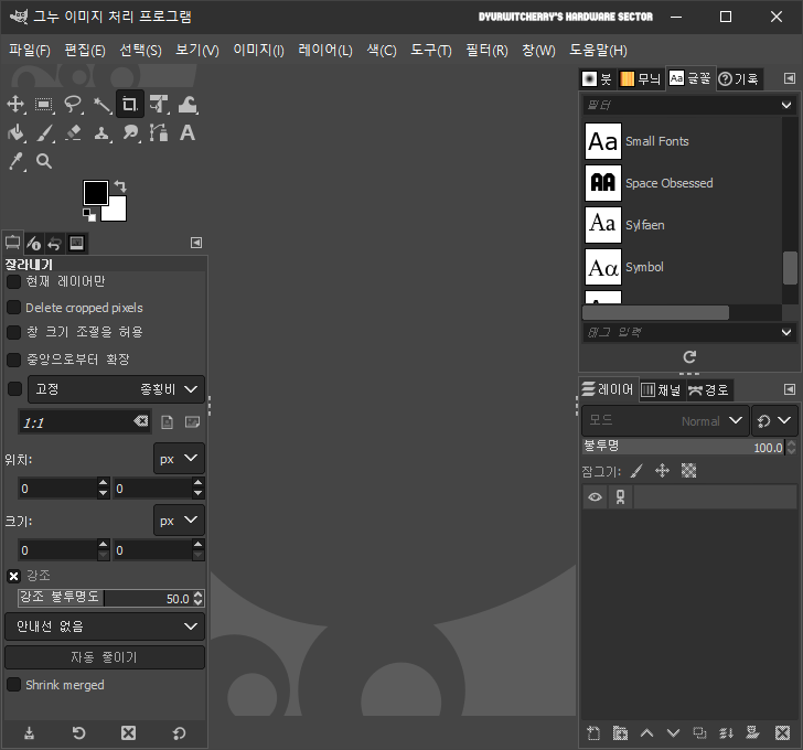 김프 한글판 설치 후 실행한 화면으로 대표적인 레스터 그래픽 편집 프로그램인 Adobe Photoshop과는 화면 구성에 약간의 차이는 있지만 기존에 분리 되어 있었던 개별 윈도우가 통합 되어 편집 도구와 레이어 등의 배치에는 큰 차이가 없으며, 어도비의 라이선스 정책이 구독 형태로 변경 된 이후 대체 프로그램으로 사용하기 적합한 그래픽 툴 입니다. 참고로, 어도비 포토샵의 PSD 파일을 불러오기 할 수도 있지만 김프의 기능에 맞게 데이터를 불러와야 하므로 포토샵에서 적용된 레이어 효과나 기타 설정이 김프에서 지원 하지 않는 경우에는 해당 부분이 누락 되어 불러오기 됩니다.