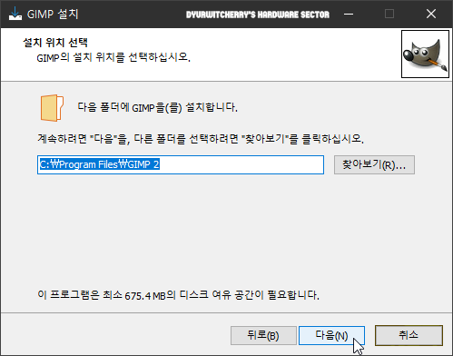 라이선스 계약 다음 단계인 GIMP 설치 위치 선택에서 'C:\Program Files\GIMP 2' 기본 설치 경로를 확인하고 '다음(N)' 버튼을 선택합니다. 참고로, GIMP 2.10.34 버전 최소 설치 공간은 675.4MB로 66.9MB인 김프와 602.8MB인 런타임 라이브러리만 설치시를 가정한 것으로 플러그인 등 전체 설치에는 1.53GB 이상의 공간을 필요로 합니다.