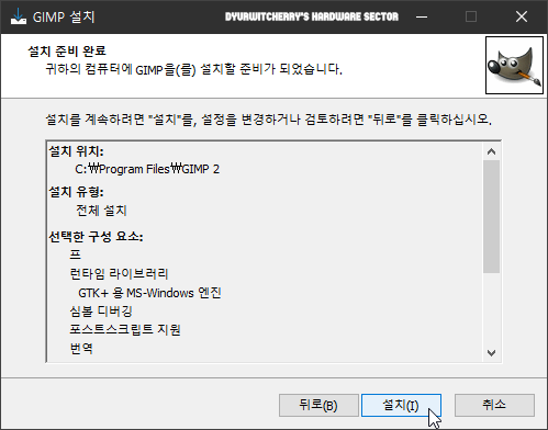 설치 준비 완료 단계에서 설치 위치와 유형, 선택한 구성 요소 등을 확인하고 '설치(I)' 버튼을 누르면 바로 설치가 진행 됩니다. 참고로 '뒤로(B)' 버튼을 클릭하여 선택 사항을 수정하고 설치 할 수도 있습니다.