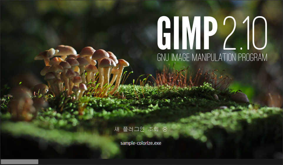 GIMP 2.10.34 버전을 실행하면 스플래시 화면(Splash Screen)이 먼저 실행되어 플러그인 등의 로드 상태가 막대 그래프 형태로 하단에 표시되며, 구성 요소 로드가 완료 된 후 김프가 실행 됩니다.