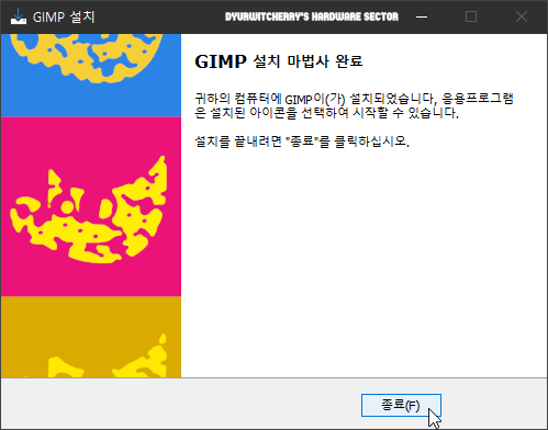 설치가 완료되면 'GIMP 설치 마법사 완료' 메시지가 나타나며, 하단의 '종료(F)' 버튼을 누른 후 바탕화면 아이콘이나 시작 메뉴의 프로그램 항목을 이용하여 김프 프로그램을 실행하여 사용하면 됩니다.