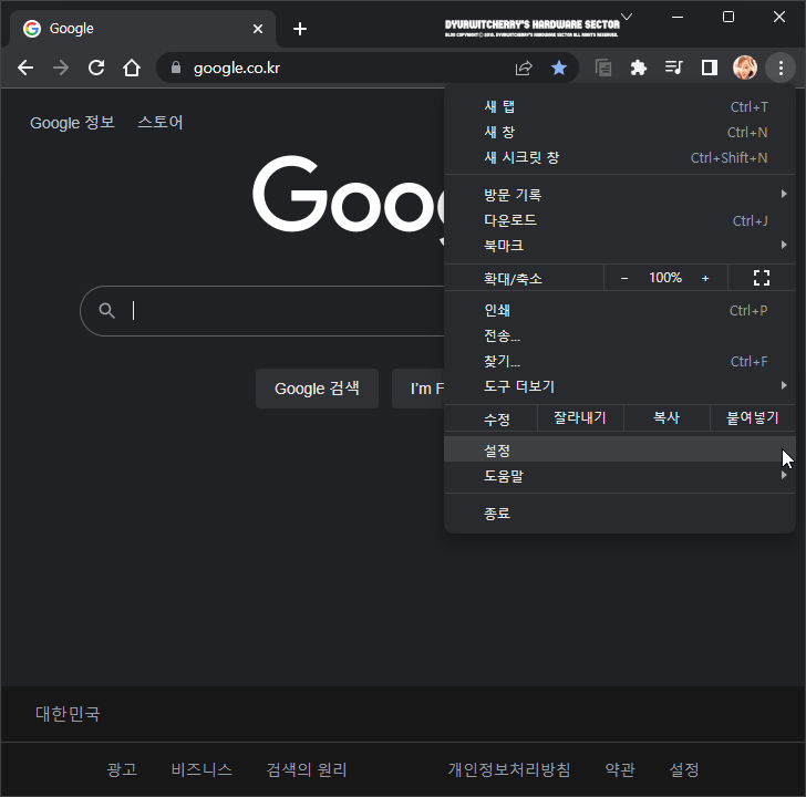 크롬 검색엔진 구글에서 네이버로 변경하는 방법은 먼저, Google Chrome Browser 상단 'URL' 주소 표시줄 우측의 세로 '⁝' 메뉴 버튼을 클릭하여 아래로 롤오버 되어 확장되는 세부 메뉴 중 '설정' 항목을 선택 합니다.