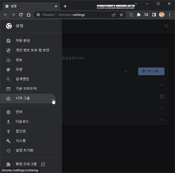 구글 크롬 브라우저 '☰ 설정(chrome://settings)' 창이 브라우저 설정에 따라 현재 창 또는 새 탭, 새 창으로 활성화 되면, 좌측 메뉴 중 '시작 그룹' 항목을 선택합니다.
