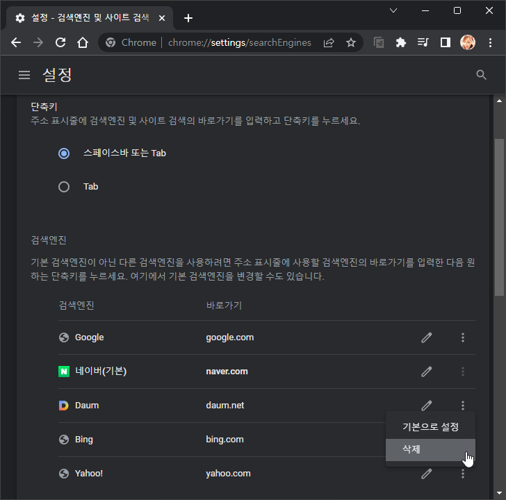 크롬 검색엔진을 Google에서 NAVER로 변경하면 검색엔진 목록에 '네이버(기본)'으로 표시되고, 기본 옵션에 추가 되어 있는 'Google'과 'Daum', Bing'과 'Yahoo!' 등의 리스트 우측의 '✐' 편집 아이콘을 클릭하여 검색엔진과 바로가기를 수정하거나 오른쪽의 세로 '⁝' 메뉴 단추를 클릭하여 '기본으로 설정' 또는 '삭제' 할 수 있습니다. 참고로, 주소 표시줄에서 바로가기를 사용하여 특정 사이트를 빠르게 검색하거나 다른 검색엔진을 사용할 수 있으며, 기본 단축키는 '스페이스바' 또는 '탭' 키 입니다.