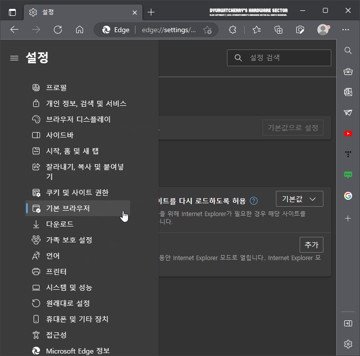 마이크로소프트 엣지 '☰ 설정(edge://settings)' 창의 좌측 메뉴 중 '기본 브라우저' 항목을 선택합니다. 앞선 단계에서 '설정 - 디스플레이' 항목에서 우측의 스크롤 바를 아래로 'Internet Explorer 모드 단추를 표시하려면 사이트를 Internet Explorer 모드에서 다시 로드할 수 있도록 허용' 메뉴를 클릭하여도 인터넷 익스플로러 호환성 페이지도 이동 합니다.