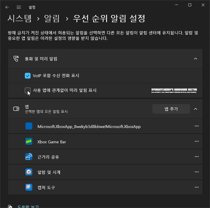 윈도우 11 '시스탬 - 알림 - 우선 순위 알림 설정'의 '통화 및 미리 알림' 메뉴의 디폴트 옵션으로 적용되어 있는 '☑ 사용 앱에 관계없이 미리 알림 표시'를 '□ 체크 해제하면, Windows 11 작업 표시줄 우측 시스템 트레이 영역에 위치해 있는 알림 센터에 앱 미리 알림이 표시되지 않게 됩니다. 참고로, 윈도우 11 방해 금지가 켜진 상태에서 허용되는 알림을 선택하면 다른 모든 알림이 알림 센터에 유지됩니다. 알람 및 중요한 앱 알림은 이러한 설정의 영향을 받지 않습니다.