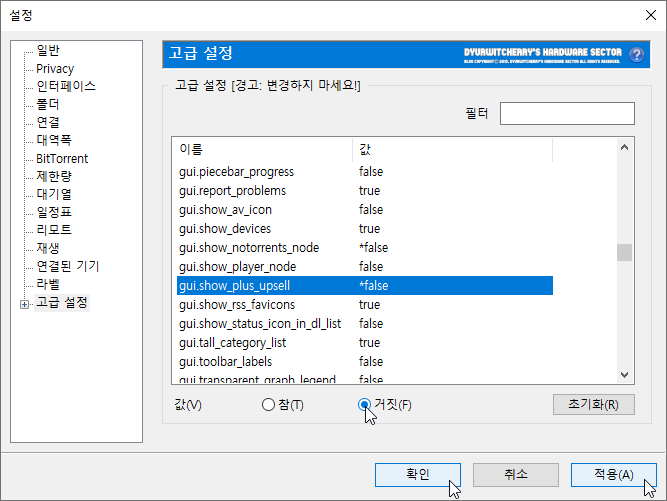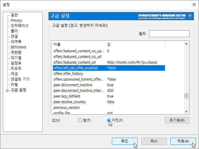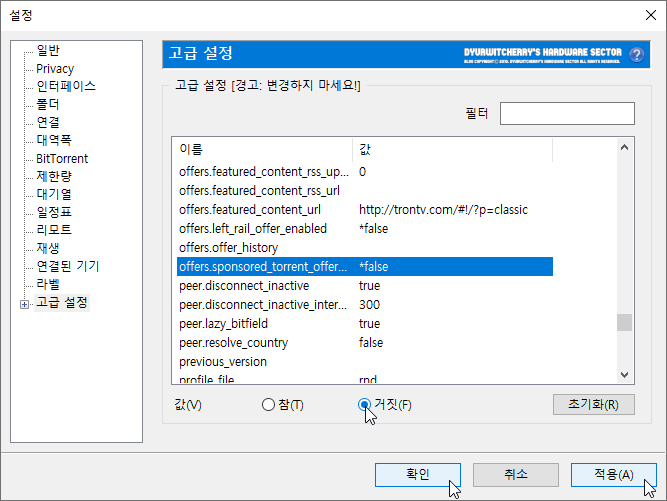 유토렌트 설정 창이 활성화 되면, 좌측 메뉴 중 '고급 설정'에서 'offers.sponsored_torrent_offer_enabled' 항목을 선택한 다음 기본 값인 '◉ 참(T)'에서 '◉ 거짓(F)'으로 변경하면 'true'에서 '*false'로 변경되며 '확인 - 적용(A)'을 누르면 µTorrent 상단 광고가 나타나지 않게 됩니다.