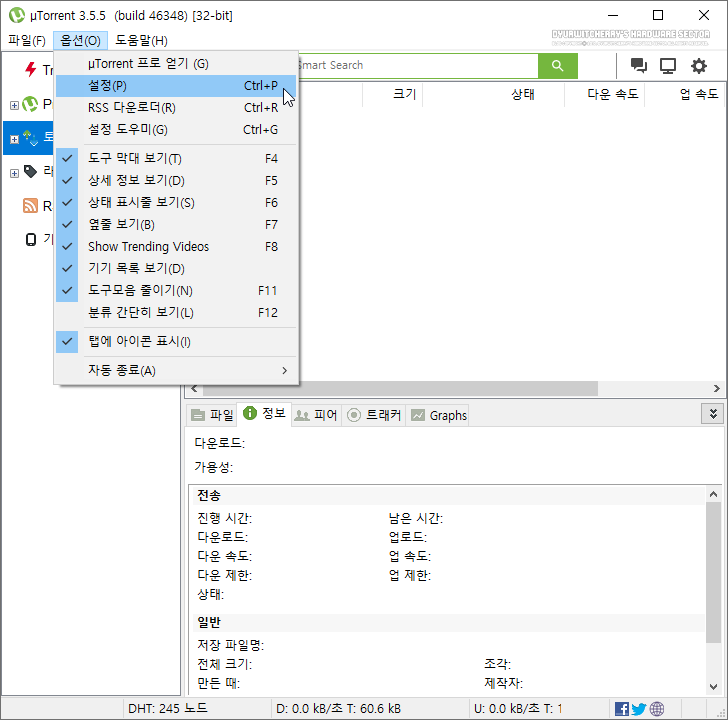 유토렌트 광고 제거하는 방법은 먼저, µTorrent Classic 프로그램 상단 메뉴 중 '옵션(O)'을 선택하여 하단으로 롤오버 되는 메뉴 중 '설정(P)'을 선택하거나 키보드 단축키 'Ctrl + P'를 입력합니다. 참고로, 포스팅에 활용한 유토렌트 클래식 버전은 'µTorrent Classic 3.5.5 Build 46348' 버전이며, 유토렌트 자동 업데이트 설정이 해제해야 광고 제거가 유지 됩니다.
