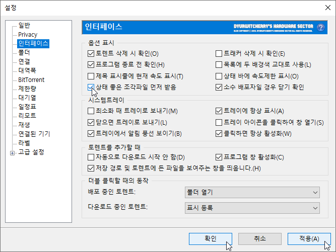 유토렌트 설정 창이 활성화 되면 '설정 - 인터페이스'의 '옵션 표시' 항목에서 디폴트 옵션으로 적용되어 있지 않은 '☑ 상태 좋은 조각파일 먼저 받음'을 '☑' 체크하고 '확인 - 적용(A)을 누르면, 배포 되는 토렌트 파일 중 업로드 속도가 무제한으로 빠르게 적용되어 있거나 시드 전체 또는 대부분의 시드가 다운로드 되어 배포되는 torrent 파일을 먼저 받아 상대적으로 다운로드 속도를 빠르게 할 수 있습니다.