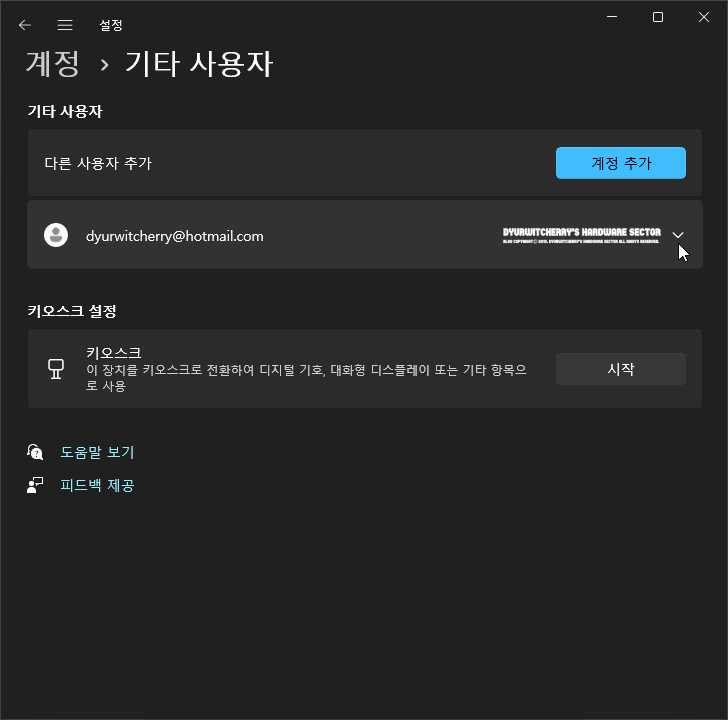 Windows 11 계정으로 이동하면 우측 세부 항목의 스크롤 바를 아래로 내려 '계정 설정' 하단의 '다른 사용자 : 장치 액세스, 직장 또는 학교 사용자, 키오스크 할당 액세스 >' 항목을 선택합니다.