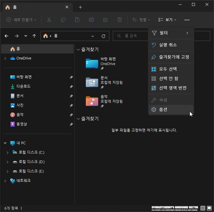 Windows 11 파일 탐색기가 시작 되면 디폴트 옵션에서는 좌측 메뉴 중 '홈' 항목으로 시작되어 우측 에는 '∨ 즐겨 찾기' 목록과 함께 최근에 사용한 파일과 자주 사용하는 폴더 등이 표시되며, 홈에서 내 PC로 변경하기 위해서는 파일 탐색기 상단 우측의 '⋯' 자세히 보기 버튼을 클릭하여 롤오버 되는 메뉴 중 하단의 '☼ 옵션을 선택 합니다.