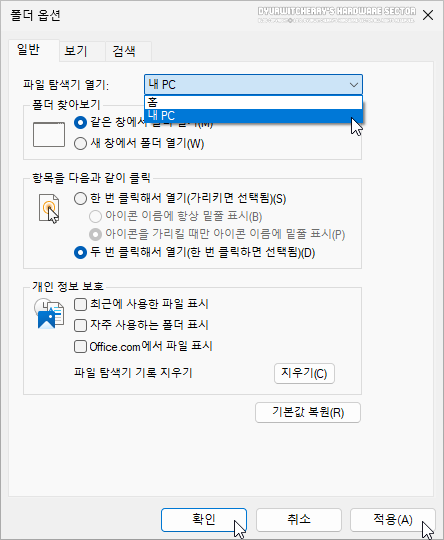 폴더 옵션 창이 활성화 되면 일반 탭의 '파일 탐색기 열기:'에 기본 값으로 적용되어 있는 '홈 ∨' 더보기 버튼을 클릭하여 '내 PC'로 변경한 후 하단의 '확인 - 적용(A)'을 누르면, 윈도우 11 파일 탐색기 시작 시 홈에서 내 PC로 변경 됩니다.