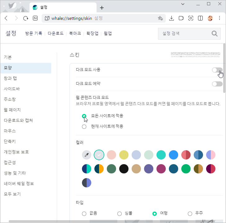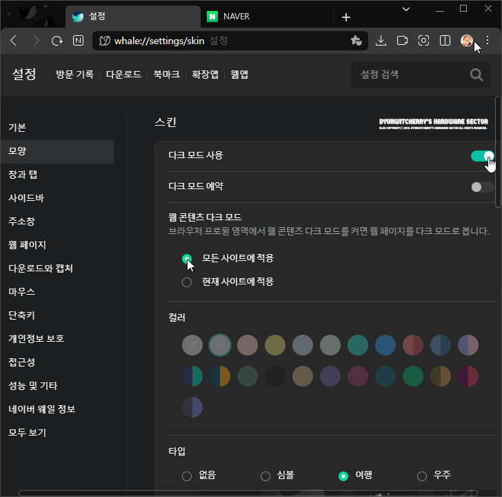 NAVER 웨일 브라우저 다크 모드 설정을 하면 설정 화면이 바로 적용되고 '웹 콘텐츠 다크 모드'는 '브라우저 프로필 영역에서 웹 콘텐츠 다크 모드를 켜면 웹 페이지를 다크모드를 봅니다.'의 기본 값 '◉ 모든 사이트에 적용' 또는 '◉ 현재 사이트에 적용' 중에서 선택하고, 우측 상단의 브라우저 프로필 영역을 클릭합니다.