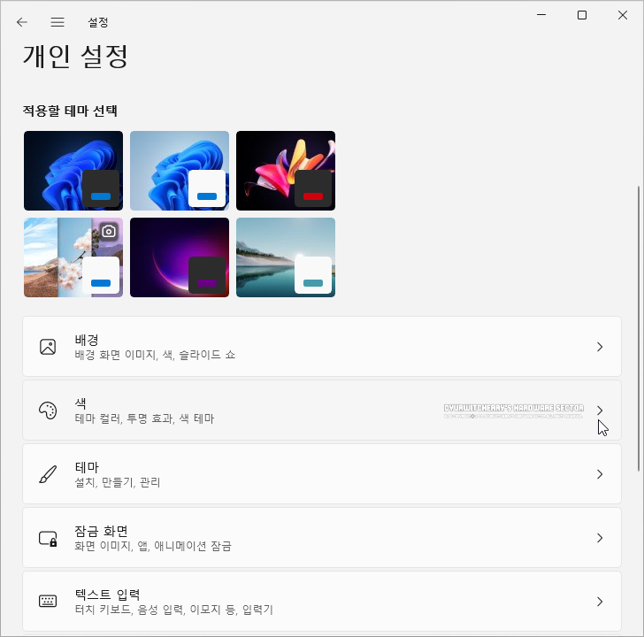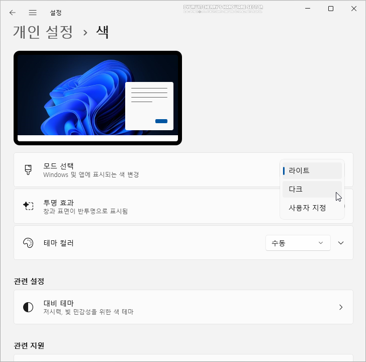 윈도우 11 '설정 - 개인 설정에서 '색 : 테마 컬러, 투명 효과, 색 테마 >' 항목을 선택하면 Windows 11 투명 효과 창과 작업 표시줄이 반투명으로 표시되는 효과 설정 및 라이트 모드를 다크 모드로 변경 할 수 있습니다.
