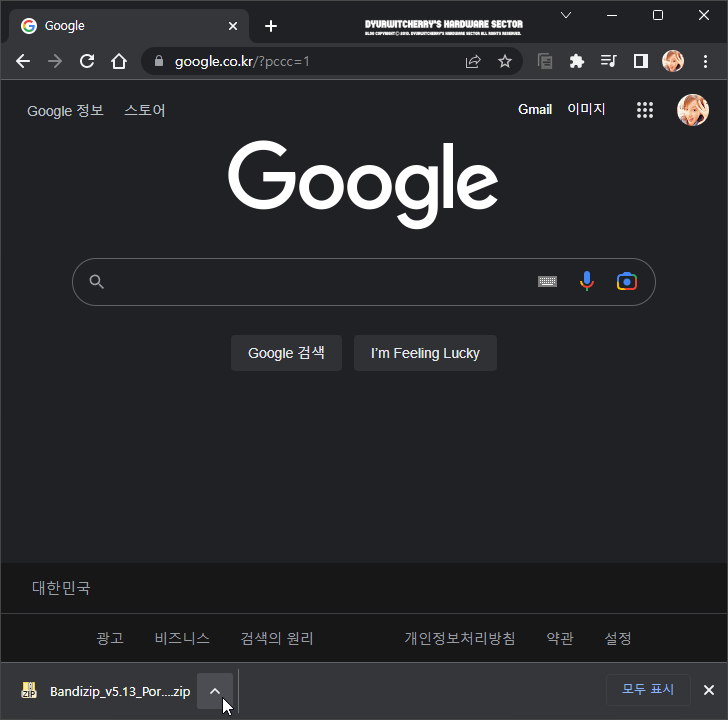 Google Chrome 브라우저에서 파일 다운로드가 완료되면 오른쪽의 '∧' 더보기 버튼을 클릭합니다. 참고로, 포스팅에 활용한 시스템은 Windows 11 Pro 버전으로, Windows XP를 지원하는 'Bandizip 5.13 Portable.zip' 파일을 다운로드 시 발생하는 상황을 화면 캡처하고 가독성 향상을 위해 이미지를 편집하여 첨부하였습니다.