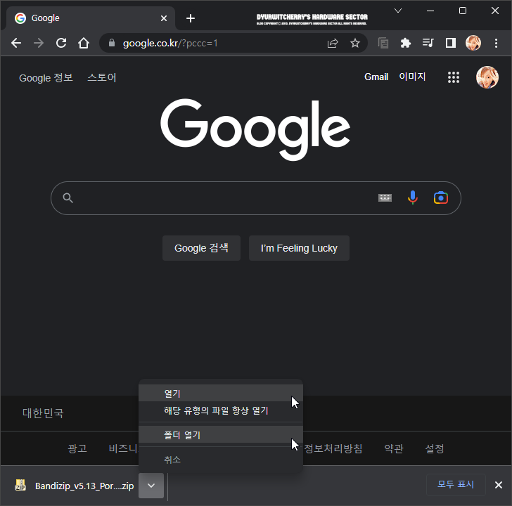 구글 크롬 브라우저에서 '! 파일은 안전하게 다운로드할 수 없습니다.' 메시지가 나타나는 파일을 '계속' 버튼을 눌러 다운로드 한 후 오른쪽의 '∧' 더보기 버튼을 클릭하면 '∨'로 변경 되면서 '열기' 또는 '폴더 열기'를 선택하여 작업을 진행할 수 있습니다. 참고로, 포스팅에 활용한 첨부 파일은 반디소프트에서 2016년 03월 25일 배포한 반디집 포터블 버전은 버전 확인을 위해 'Bandizip 5.13 Portable.zip'으로 변경하여 첨부한 것으로 원본 파일과 동일하며, 해외에서 파일을 다운로드 받을 시에 메시지가 나타나는 경우에는 항상 주의가 필요 합니다.
