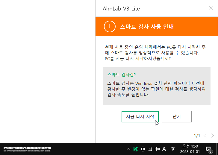 안랩 V3 라이트 프로그램 실행과 함께 V3 제품 안내 페이지가 기본 브라우저로 활성화 되고, AhnLab V3 Lite '! 스마트 검사 사용 안내' 팝업 창이 시스템 트레이에서 활성화 되어 현재 사용중인 운영 체제에서는 PC를 다시 시작한 후에 스마트 검사를 정상적으로 사용할 수 있습니다. PC를 지금 다시 시작하시겠습니까?' 메시지가 나타나며, '지금 다시 시작' 버튼을 누르면 시스템이 다시 시작 됩니다.