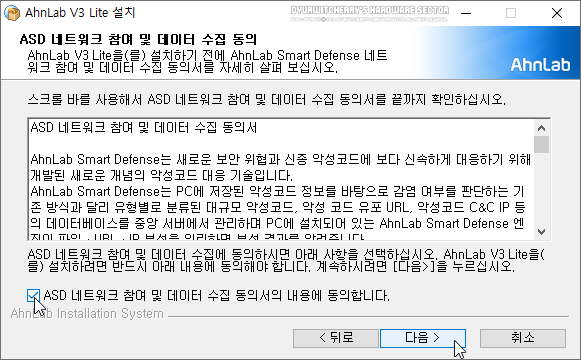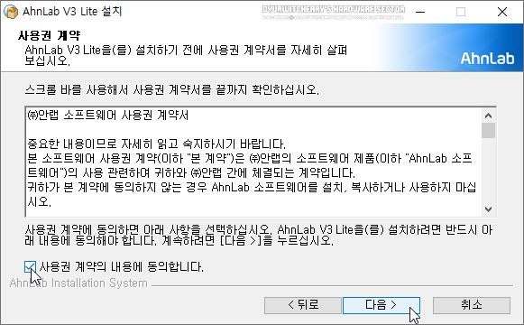사용권 계약 'AhnLab V3 Lite을(를) 설치하기 전에 사용권 계약서를 자세히 살펴보십시오. 하단의 '☑ 사용권 계약의 내용에 동의합니다.'에 체크하고 '다음 >' 버튼을 선택합니다.