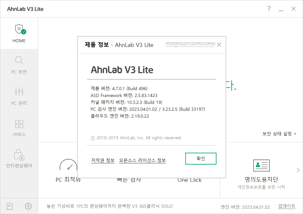 안랩 V3 라이트 우측 상단의 '?' 도움말의 '제품 정보'에는 AhnLab V3 Lite 제품 버전: 4.7.0.1 (Build 496), ASD Framework 버전: 2.5.83.1423, 커널 패키지 버전: 10.3.2.3 (Build 19), PC 검사 엔진 버전: 2023.04.01.02 / 3.23.2.5 (Build 33197), 클라우드 엔진 버전: 2.19.0.22 세부 정보를 확인 할 수 있습니다. 참고로, V3 Lite는 개인 사용자에 무료로 사용할 수 있는 백신 프로그램으로, 광고가 포함되어 있으며, 환경 설정의 광고 표시 설정에서 '☑ 30일간 광고 보지 않기'를 체크하여 프로그램 하단에 광고 배너가 나타나지 않게 할 수 있습니다.