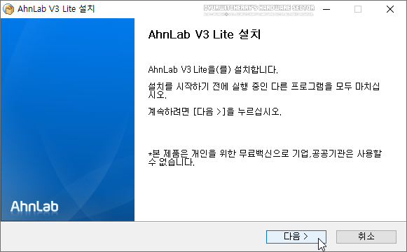 AhnLab V3 Lite 설치 창이 활성화 되면 '*본 제품은 개인을 위한 무료백신으로 기업, 공공기관은 사용할 수 었습니다.' 메시지를 통해 개인 사용자에 한정하여 사용할 수 있는 무료 백신 프로그램임을 확인할 수 있으며, 하단의 '다음 >' 버튼을 선택하면 사용권 계약 동의 과정이 진행 됩니다.