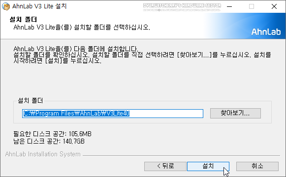 AhnLab V3 Lite 설치 폴더는 'C:\Program Files\AhnLab\V3Lite40' 경로가 디폴트 옵션으로 적용되어 있어, 다른 위치에 설치하고자 하는 경우에는 '찾아보기...'버튼을 V3 라이트 설치 경로를 변경할 수 있으며, 하단의 '설치' 버튼을 누르면 바로 설치가 진행 됩니다.