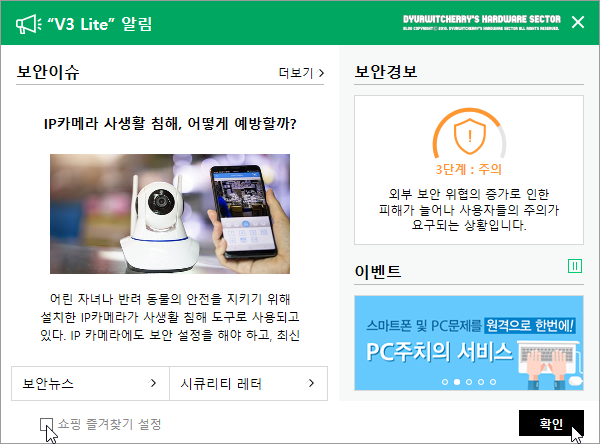 AhnLab V3 Lite 설치 완료 후 실행되면서 프로그램 화면에 'V3 Lite 알림 창'이 활성화 되는데, 앞선 단계에서 '□ 즐겨찾는 쇼핑 바로가기 추가' 항목을 체크 해제하여도 보안이슈 하단에 '☑ 쇼핑 즐겨찾기 설정'에 체크되어 있어 창을 닫기 전에 '□' 체크 해제하고 '확인' 버튼을 누르면 됩니다.