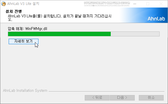 안랩 V3 라이트 설치는 압축 해제와 파일 복사, 시스템 복원 지점 생성과 서비스 생성 과정을 거친 후 제품 업데이트 단계로 진행되며, 업데이트 과정에는 '업데이트 중...' 메시지가 나타나면서 다소 시간이 소요 됩니다. 참고로, '자세히 보기' 버튼을 클릭하면 진행 상황을 세부적으로 확인 할 수 있습니다.