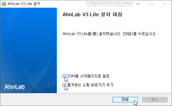 AhnLab V3 Lite 다운로드 및 설치가 완료 되면 설치 마침 화면에 '☑ ZUM을 시작페이지로 설정'과 '☑ 즐겨찾는 쇼핑 바로가기 추가' 항목이 체크되어 있어서 사용하지 않는 경우에는 '□' 체크 해제하고 '마침' 버튼을 선택해야 시작 페이지가 ZUM으로 고정되지 않고 쇼핑 바로가기 추가 등의 광고성 정보가 전송되지 않게 됩니다.